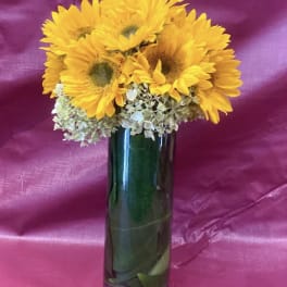 Price: $110.00 Custom Arrangement of Sunflowers & Israeli Ruscus in clear glass cube with leaf wrap Product Tags: Same-day Delivery