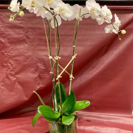 Price: $200.00 Double stem white phalaenopsis orchid planting with bamboo, raffia & moss Product Tags: Same-day Delivery