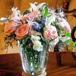 Price: $300.00 Custom arrangement of Casablanca lilies, white roses, white lisianthus & greens in clear glass vase Product Tags: Same-day Delivery