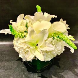 Price: $300.00 Custom arrangement of white hydrangea, white calla lilies, Casablanca lilies & white roses Product Tags: Same-day Delivery